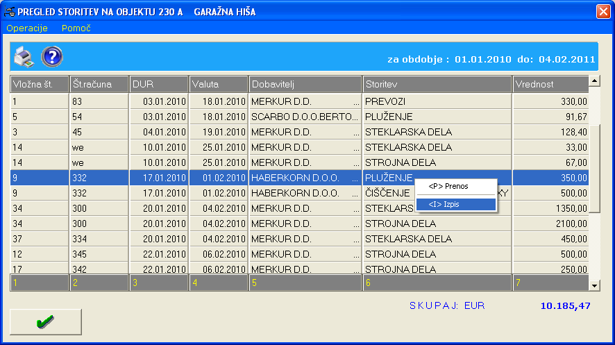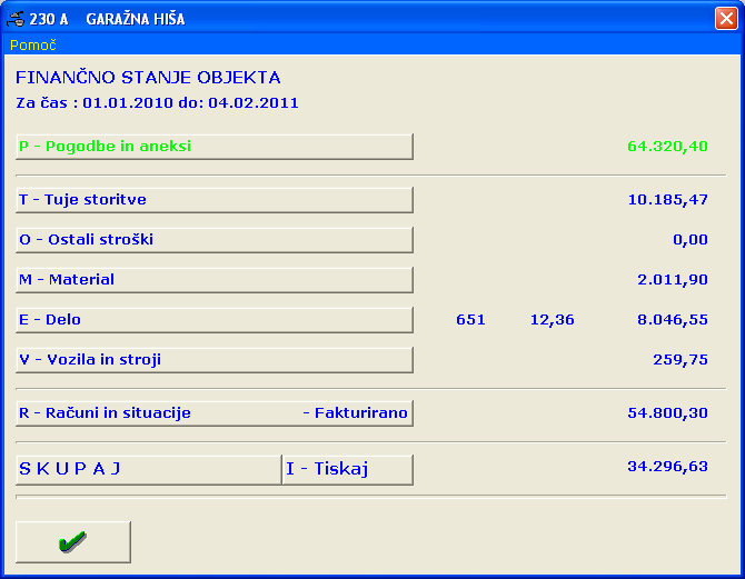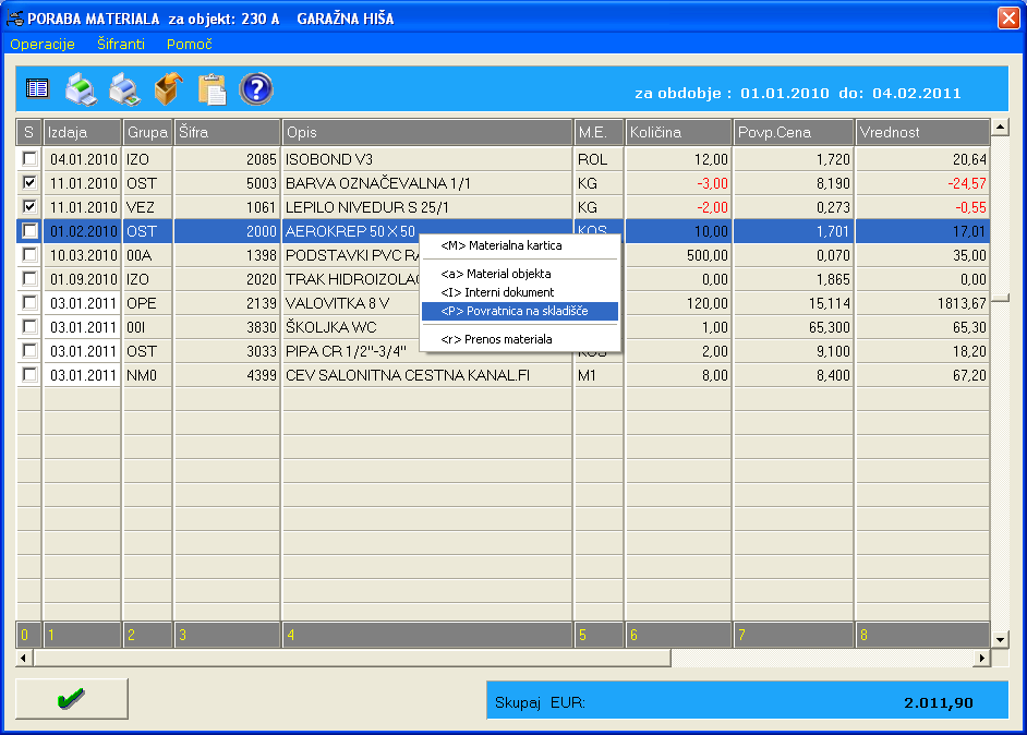 pripraviti tudi skupno tabelo pokalkulacij za izbrane objekte in
